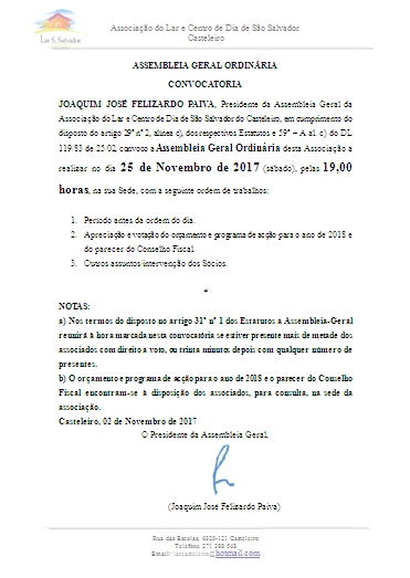novembro teve lugar a Assembleia Geral dos sócios da Associação do Lar e Centro